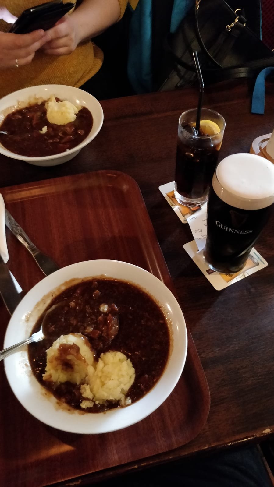 Daarna gingen wij weer naar de bus en werden wij naar een pub gebracht om even lekker wat te gaan eten en drinken na al die koude wind en het prachtige uitzicht. In deze pub kregen wij de heerlijkste Irish stew die we deze vakantie op hebben! Het was meer hachee, met twee bolletjes aardappelpuree (haha dat rijmt!). Blijkbaar zat er in de saus van de hachee, een beetje Guinness bier doorheen gemixt wat de smaak versterkte.