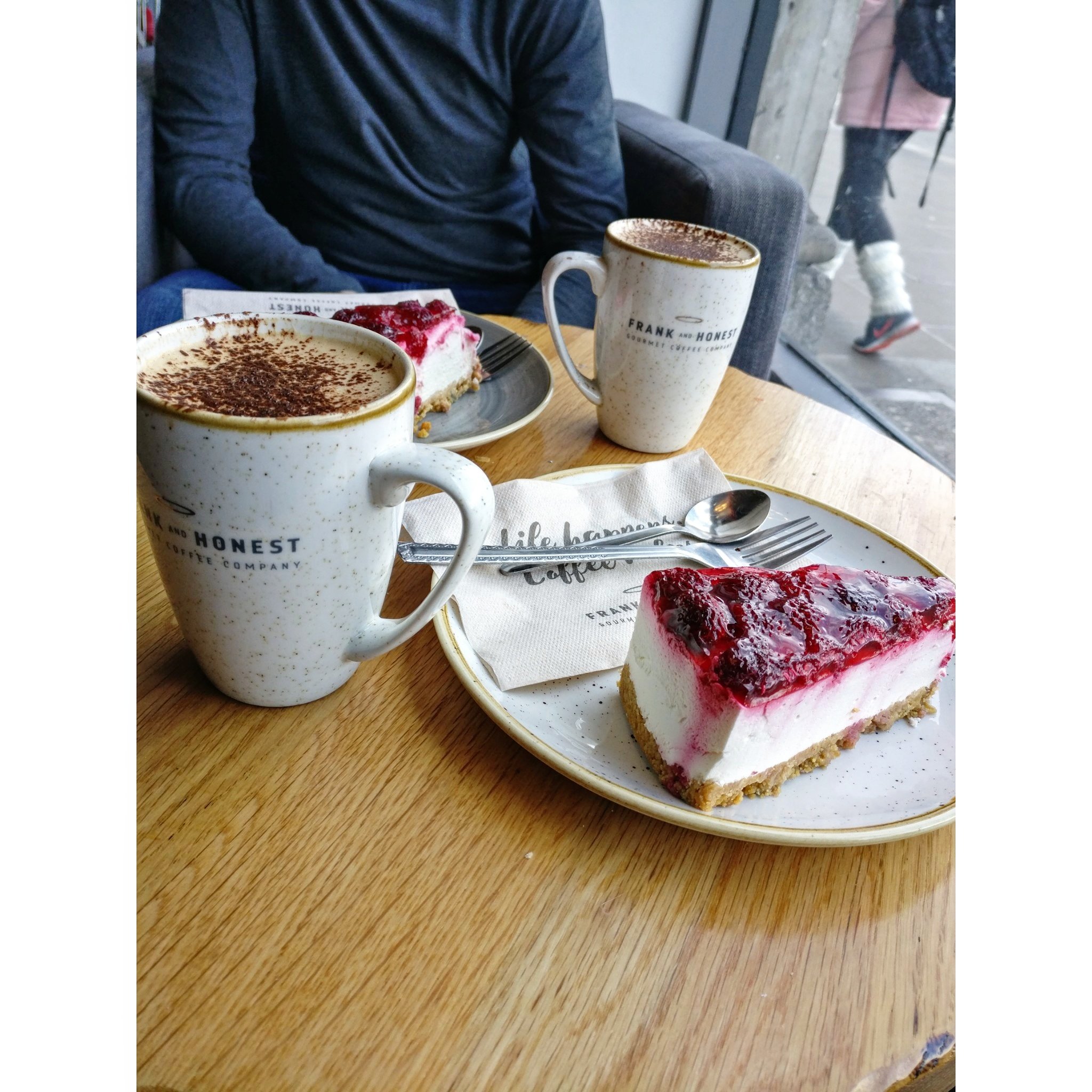 Nadat wij ons hadden ingecheckt bij het Beresford hotel, mochten wij onze kamer nog niet in, dus besloten wij om onze koffers achter te laten en een beetje rond te lopen en ergens wat te gaan drinken. Wij zijn bij een klein cafeetje / supermarkt wezen drinken/knabbelen om van onze vlucht bij te komen. Samen hebben wij twee cappuccino’s en een heerlijke cheesecake op!