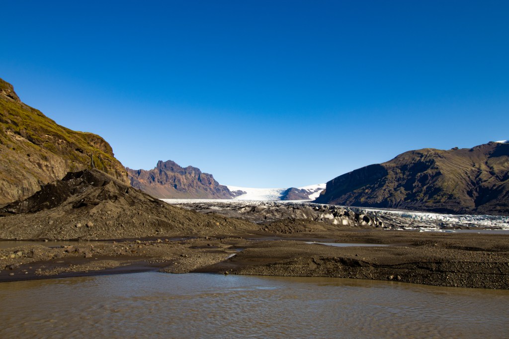 Tot Cindy opeens aan me vroeg: “Kunnen we er niet gewoon heenlopen vanaf een pad hier ergens?”. Nadat ik even snel op google maps had gekeken bleek dit zowaar te kunnen! Althans… Je kon aardig dichtbij komen en dit pad bleek vanuit dezelfde parkeerplaats bij Svartifoss te starten! We zijn direct door gegaan met lopen en dit pad was mega relaxed. Eindelijk een pad zonder heuvels! Na ongeveer 45 minuten lopen in het heerlijke zonnetje dat we die dag hadden, kwamen we op het punt waar we niet meer dichterbij konden komen. Hoe dichter we bij de gletsjer kwamen, hoe kouder de lucht om ons heen werd. Het was alle moeite meer dan waard om daar heen te lopen! Wat een gigantische muur van ijs. In de winter periodes zijn er ook excursies om over de gletsjer te lopen. Dat lijkt me ook echt indrukwekkend! Misschien dat we dat ook ooit nog mee mogen maken.