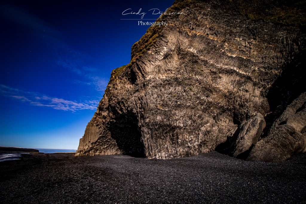 Dit omdat er precies een gigantische bergwand de twee stranden van elkaar scheid. Na ongeveer 10 minuutjes rijden kwamen we aan bij de parkeerplaats waar alweer bijna geen auto’s te zien waren. Dit zorgde ervoor dat de veel bezochte vulkanische zuilen helemaal leeg waren voor ons! Wat dus normaal volgens alle verhalen een gestoei voor een foto zou zijn was voor ons een rustige 15 tot 20 minuten foto’s maken van het bizar mooie natuurverschijnsel. Zoals ze wel vaker zeggen; vroege vogels vangen de dikste wormen!