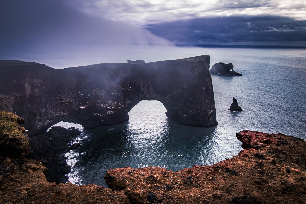 Na deze waterval zijn we vervolgens teruggereden naar het stadje Vík omdat we daar totaal een uitkijkpunt hadden gemist; Dyrholaey. Hierheen rijden was best weer een aardige afstand, maar het uitkijkpunt was erg bijzonder! Het uitkijkpunt was een erg steile grindweg omhoog om vervolgens te eindigen in de mistige wolken bovenop de bergwand naast Vík. Vanuit hier had je uitzicht over de zee en de rotsformaties in het water. Zeer zeker een aanrader!